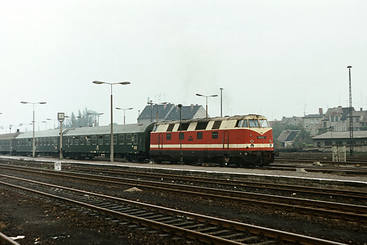 Die Oebisfelder 118 032 verläßt mit dem D 442 Dresden - Köln den Bahnhof Stendal, 23.10.1982. |