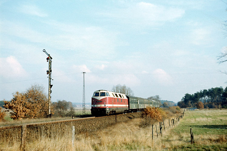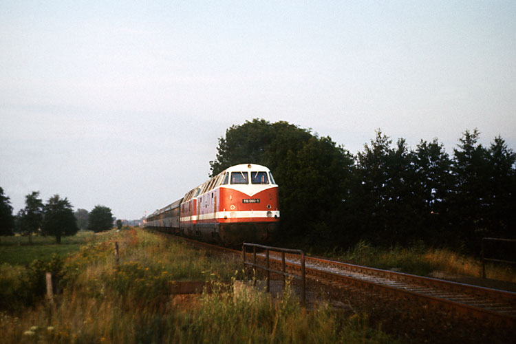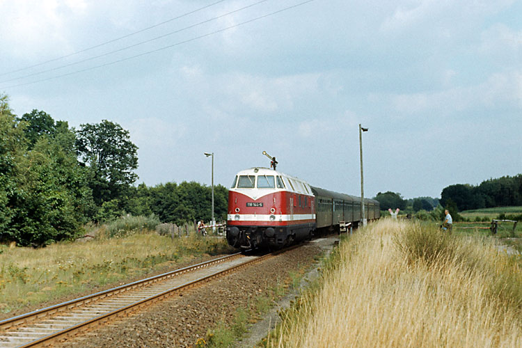Das Bw Oebisfelde beheimatete Anfang der achtziger Jahre zeitweise auch die sechsachsige Ausführung der 118. Hier ist eine an der Blockstelle 107 mit dem TEEM 41441 Rotterdam - Seddin unterwegs, 27.07.1982. |