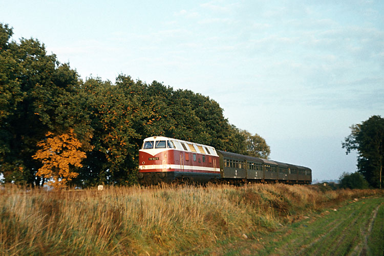 118 144 Bw Oebisfelde hat mit dem P 9424 Stendal - Oebisfelde Gardelegen fast erreicht, 21.10.1982. |