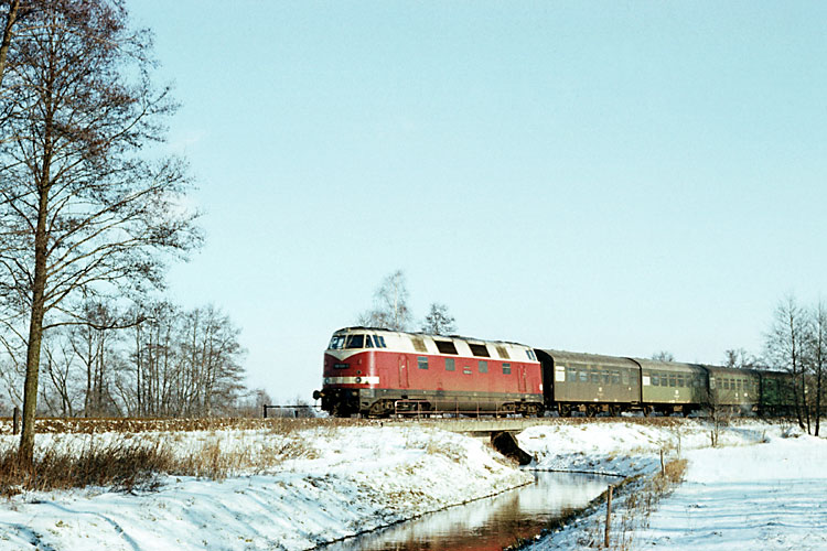 An gleicher Stelle überquert die Oebisfelder 118 569 mit dem P 9414 Stendal - Oebisfelde die bei Gardelegen noch als Bach dahinfließende Milde, 29.01.1987. |