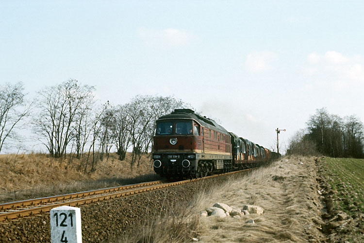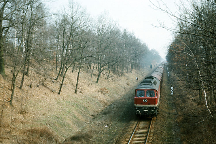 Am 27.03.1984 hatte 132 339 Bw Stralsund den TEEM 41463 am Haken, hier an der Blockstelle 96 bei Börgitz. |