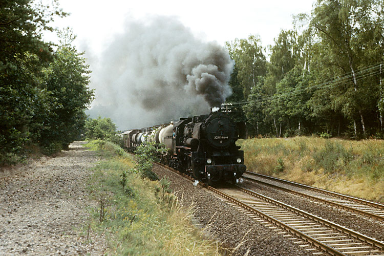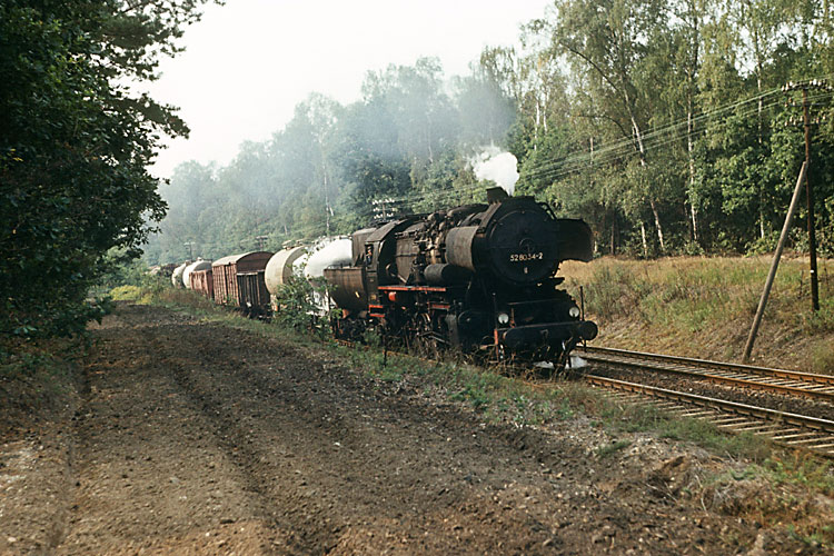Am 12.09.1982 wartete ich im Wald bei Luko wiederum auf die Güstener 41. Erneut kam kurz vor deren Personenzug in Gegenrichtung der N 66653 nach Wittenberg, diesmal bespannt mit 52 8034. |