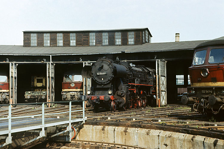 Als sich mir die Möglichkeit eröffnete an einer offiziellen Bw-Besichtigung des Modellbahnverbandes in Falkenberg teilzunehmen, nutzte ich diese gerne. Immerhin bekam ich dabei alle drei verbliebenen Altbau-52 des Bw Falkenberg zu Gesicht. 52 5660 stand leider ohne Schilder kalt abgestellt und 52 5679 war in der Einsatzstelle Eilenburg, für die unsere Fotogenehmigung nicht galt. So blieb nur die "Teilreko" 52 5448, die an jenem Tag als Dispolok einsatzbereit im Bw stand und für uns in Position gefahren wurde, 25.07.1982. |