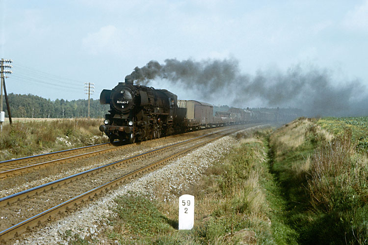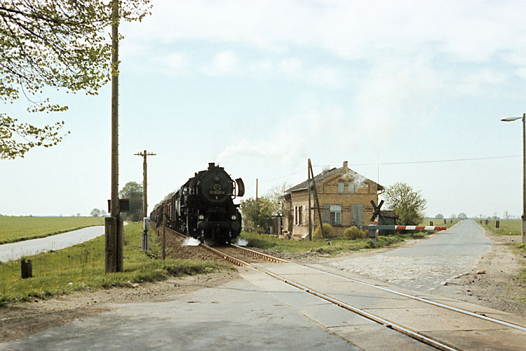 Meine einzige Tagestour zu den Falkenberger 52 machte ich am 08.05.1985. Es ging an die Strecke Falkenberg - Jüterbog, wo mir bei Reicho zuerst 52 8025 mit dem N 60678 nach Jüterbog vor die Linse fuhr. |