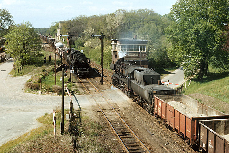 Höhepunkt und gleichzeitig letztes Bild des Tages war kurz darauf die Begegnung der beiden eingesetzten Loks im Bahnhof Herzberg West. Während 52 8044 mit dem Kieszug den Bahnhof ohne Halt durchfuhr, blieb 52 8025 mit ihrem Nahgüter auch danach noch für unbestimmte Zeit im Bahnhof stehen, da der Falkenberger Güterbahnhof mal wieder überfüllt war, 08.05.1985. |