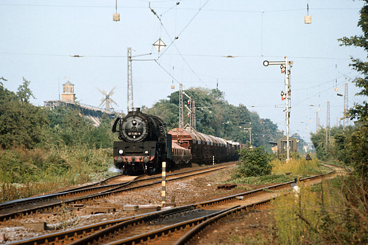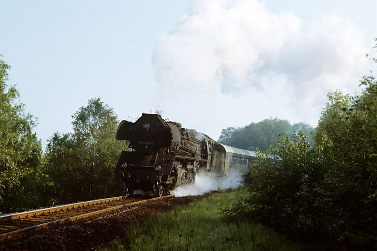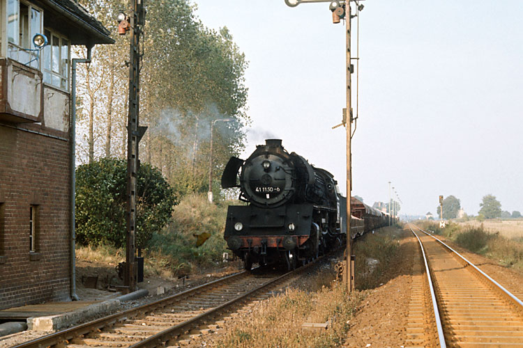 Der Gegenzug ist durch und 41 1150 kann in Eickendorf eine beeindruckende Anfahrt hinlegen, 04.10.1987. |