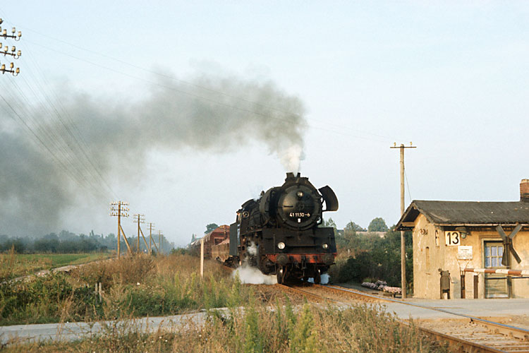 Weiter geht es für 41 1150 mit dem Dg 54751, er passiert den Posten 13 zwischen Förderstedt und Staßfurt, 03.10.1987. Zu dieser Zeit war der Einsatz der Baureihe 41 bei der Deutschen Reichsbahn so gut wie beendet, bestenfalls eine Lok pro Tag lief von der Einsatzstelle Staßfurt aus noch im Zugdienst. |
