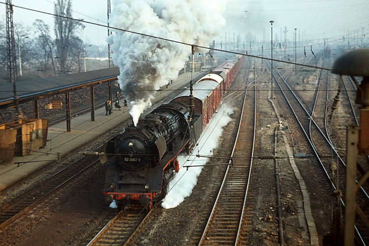 Zum allerersten Mal fuhr mir bei einer Fototour nach Magdeburg eine Halberstädter 50 vor die Linse - 50 3662 hat mit dem Dg 54774 nach Halberstadt gerade den Rangierbahnhof Rothensee verlassen und passiert den S-Bahn - Haltepunkt Eichenweiler - 02.04.1982. |