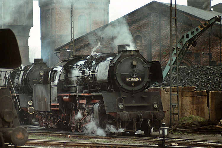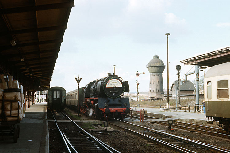 Neugierig geworden was dampfmäßig so in Halberstadt lief, machte ich mich am 17.04.1982 erstmals auf den Weg dorthin. Als ich aus dem Zug die in der Einsatzstelle Oschersleben pausierenden 50er sah, entschloß ich mich spontan zu einem Zwischenstop. An jenem Tag räucherten dort vor sich hin: 50 3559, 3575, 3606, 3631 und Heizlok 3568. |