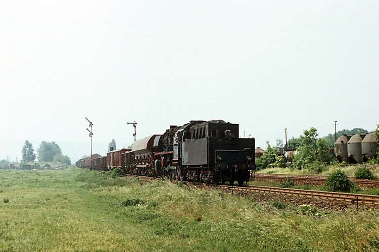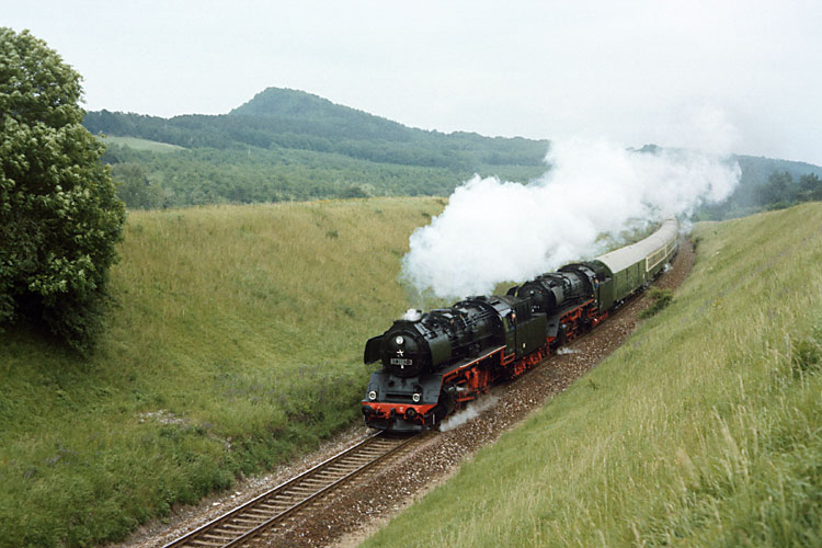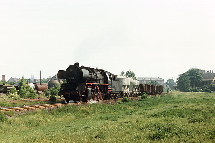 Auch vor Sonderzügen waren Halberstädter 50 mehrfach zu sehen. Am 21.06.1987 durfte 50 3552 zusammen mit der Güstener 41 1231 einen Sonderzug des Modellbahnverbandes Magdeburg nach Blankenburg und zurück bespannen. Hier fährt der Zug auf der Rückfahrt bei Langenstein Halberstadt entgegen. |