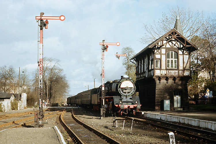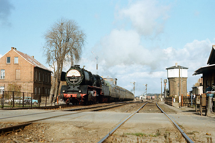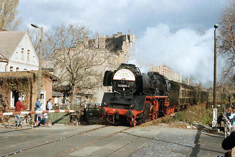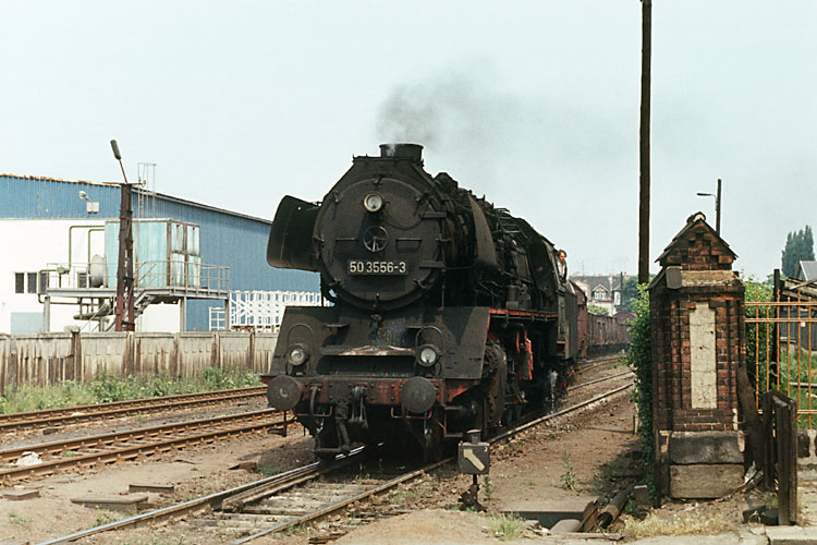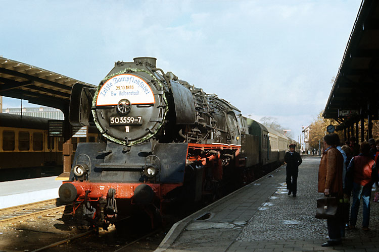 50 3559 hatte die Ehre, am 29.10.1988 die Abschiedsfahrten vom Dampfbetrieb in Halberstadt und somit vom Regelspurdampf in Deutschland durchzuführen. Nachdem die Einsatzstelle Oschersleben die letzten Dampfeinsätze unter anderem mit dieser Lok gefahren hatte, bespannte man an jenem Tag mit der Lok den Personenzugumlauf P 8447 / 8448 / 8457 Halberstadt - Magdeburg - Thale - Halberstadt, um würdig Abschied von der Dampftraktion zu nehmen. Hier der P 8448 bei der Ausfahrt Oschersleben. |