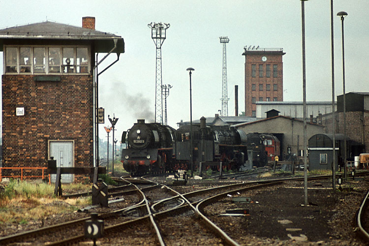 Ein Blick mit dem Tele vom Bahnsteig ins Bw Halberstadt - vorne steht 50 3552, dahinter 01 1511, noch eine 50 und eine 120, 13.06.1982. Nach diesen ersten Touren im Jahr 1982 machte ich in Sachen Halberstädter 50 erstmal Pause, schließlich gab es zu jener Zeit noch wesentlich dringlichere Dampf - Reiseziele. |