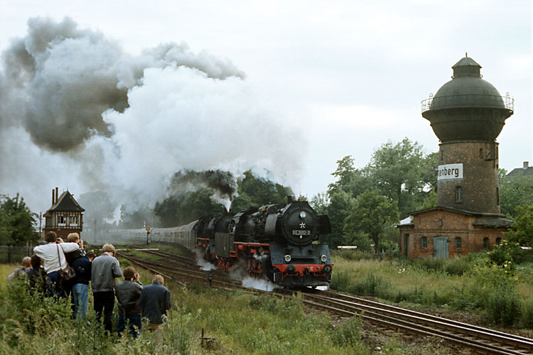 Nun ist der Zug nicht mehr weit vom Zielort Magdeburg und verläßt vor den Objektiven zahlreicher Eisenbahnfans den Bahnhof Blumenberg. |