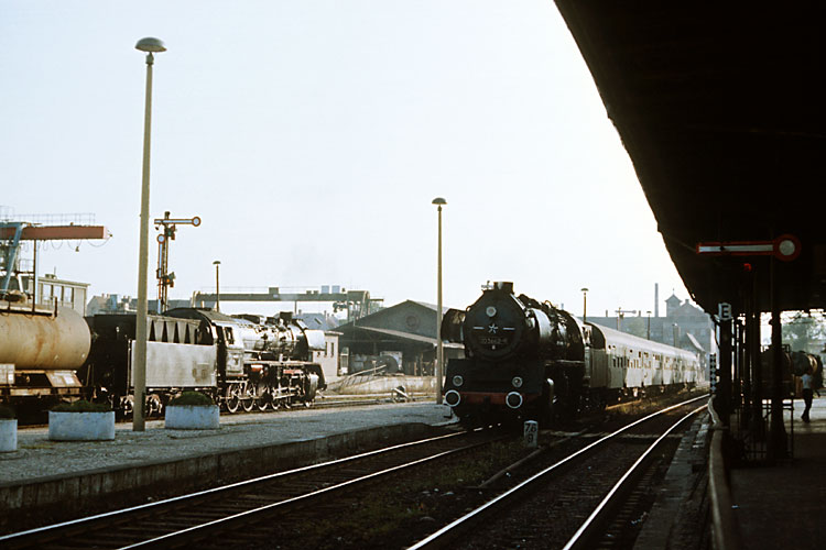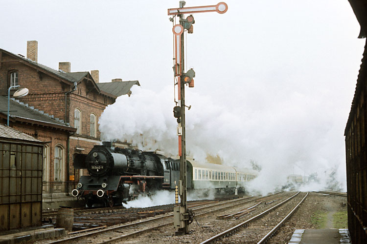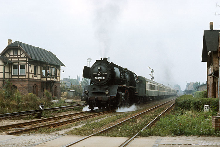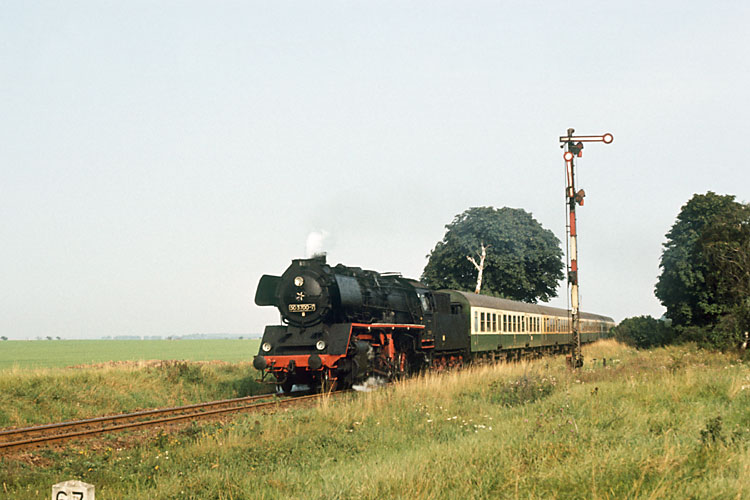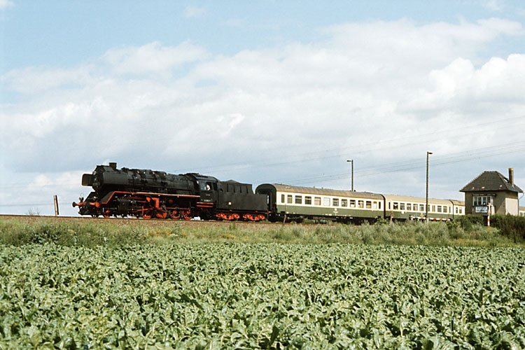 Am 28.08.1984 hatte 50 3700 den P 19408 am Haken, sie hat soeben Wegeleben durchfahren. Das Zugpaar P 19408 / P 19413 war das einzige planmäßig dampfbespannte bei der DR, das reinrassig in den damals neuen Farben des DR - Schnellverkehrs grün / beige verkehrte. |