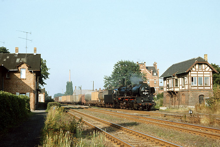 50 3662 fährt mit dem N 66794 Halberstadt - Quedlinburg durch den Bahnhof Ditfurt, 23.08.1987. |