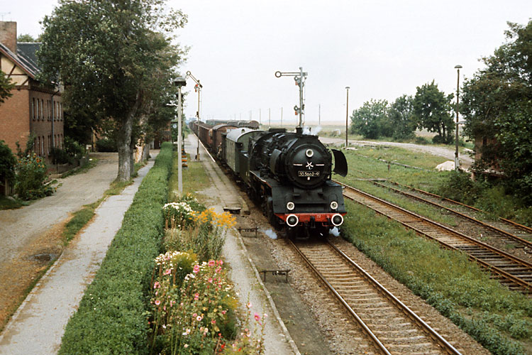 Im Frühjahr 1988 war als letzte noch 50 3662 beim Bw Halberstadt im Einsatz, hier durchfährt sie mit dem P 19408 (Berlin) - Halberstadt - Thale den Bahnhof Wegeleben, 09.04.1988. Der P 19408 lief als sogenannter "beschleunigter Personenzug" und hielt nur in Quedlinburg. Bis Halberstadt liefen die Wagen im D 640 Berlin - Wernigerode mit, dort wurde der Zug geteilt. |