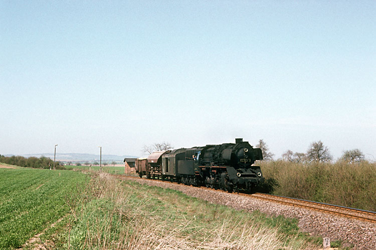 50 3606 rollt mit dem N 64784 bei Eilenstedt durch das Harzvorland, 29.04.1987. |