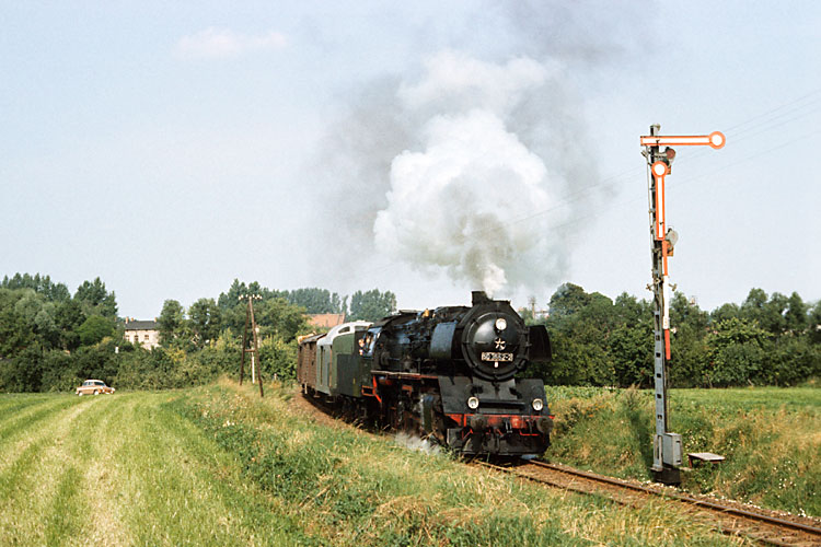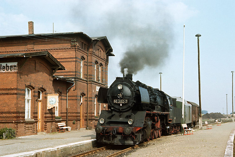 Nur bei Bedarf wurde im Güterverkehr bis zum Endbahnhof Dedeleben gefahren, meist wendete das Güterzugpaar in Badersleben. Am 23.08.1987 war Bedarf und 50 3552 durchfährt mit einem Wagen als Üa 74700 Vogelsdorf. |