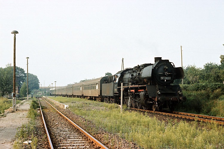 Nur werktags konnte man in den Achtzigern die 50er auf der Dedelebener Strecke auch im Reisezugdienst erleben, hier steht 50 3553 mit dem P 15434 nach Halberstadt im Bahnhof Dedeleben abfahrbereit, 01.09.1987. |
