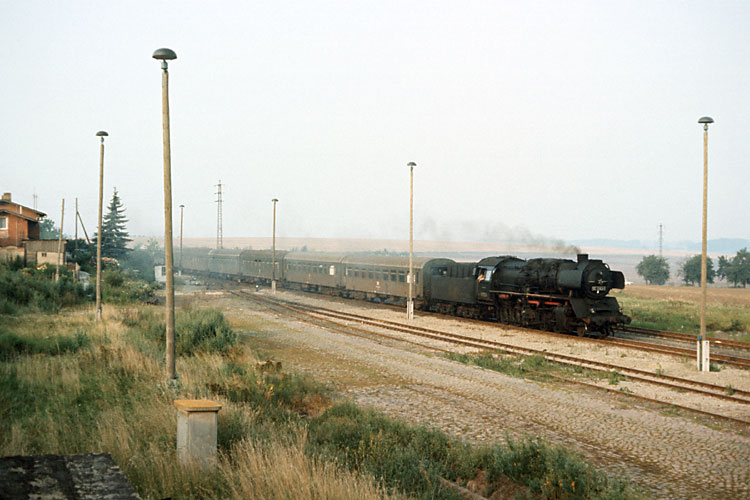 50 3553 bremst mit dem P 15434 zum Halt im Bahnhof Schwanebeck, 01.09.1987. |