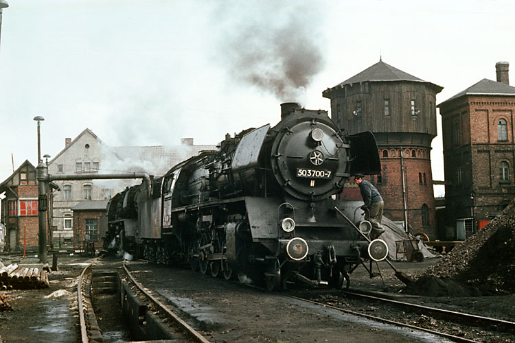 50 3700 ist von einem Einsatz zurückgekehrt und wird nun in der Einsatzstelle Oschersleben restauriert, 12.04.1987. Hinter ihr steht noch 50 3556 als Reservelok bereit. Besonders zum Ende der Dampflokzeit ließen die Eisenbahner hier den Fotografen freie Bahn. |