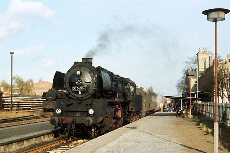 Auch am 09.04.1988 brachte 50 3606 den Gmp 68728 nach Gunsleben, hier steht sie mit dem Zug im Bahnhof Oschersleben abfahrbereit. |