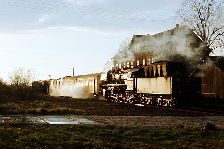 Der Zug am 09.04.1988 in Gunsleben nochmals von der anderen Seite aufgenommen. Der Heizer hat inzwischen ein paar Schippen Kohle in die Feuerbüchse der 50 3606 befördert, gleich wird die Rückfahrt nach Oschersleben beginnen. Wir verabschieden uns damit von dieser kurzen Strecke und wenden uns als letztes der Hauptbahn Magdeburg - Oschersleben zu. |