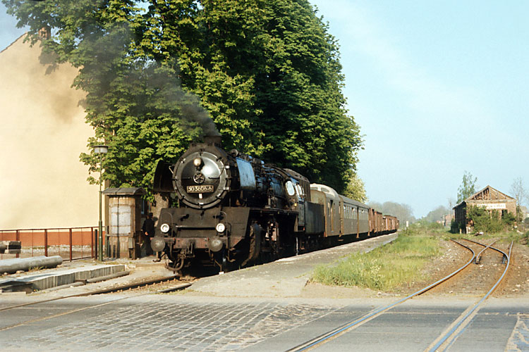 Los gehts - der Gmp verläßt gezogen von 50 3606 Oschersleben, 07.05.1988. |