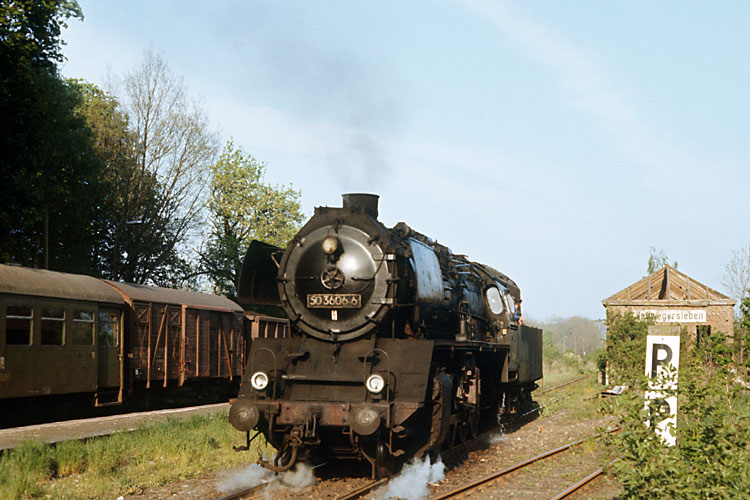 50 3606 steht nun mit dem Gmp 68729 nach Oschersleben abfahrbereit im Bahnhof Gunsleben, 09.04.1988. |