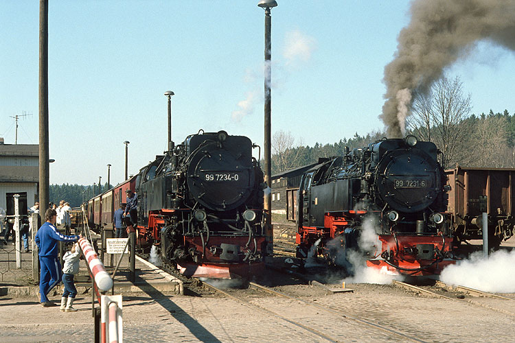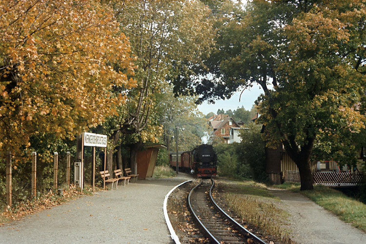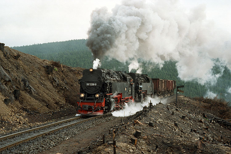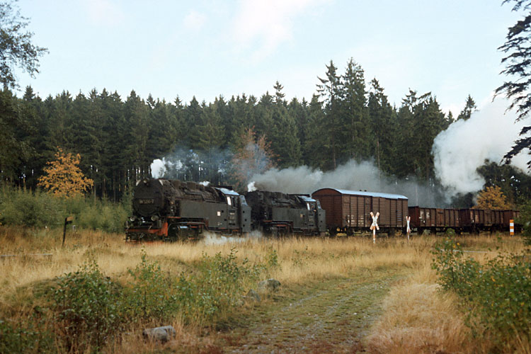 Die nächste Harztour unternahm ich im Herbst 1989 kurz vor den Ereignissen, die auch dieser dicht am Eisernen Vorhang liegenden Bahn viele Veränderungen bringen sollten. Noch war aber nichts davon zu spüren und das Erreichen der westlichen Ausfahrt des Bahnhofes Drei Annen Hohne mit dem Auto von der Laune der oft vor Ort weilenden Polizei abhängig. Am 14.10.1989 glückte mir dieses, als der Nahgüter 67771 nach Benneckenstein mit 99 7235 + 7237 angefahren kam. |