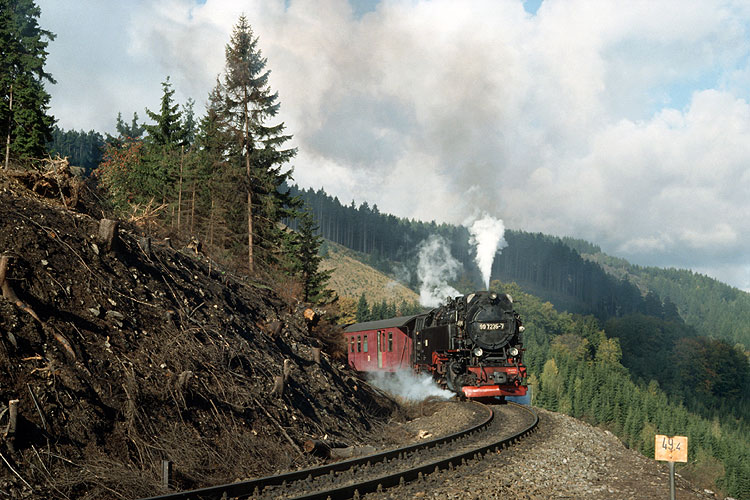 Ich verfolgte den P 14405 noch, da ich danach an die Selketalbahn wechseln wollte. Unweit der ehemaligen Ladestelle Kälberbruch zwischen Benneckenstein und Tiefenbachmühle hat 99 7235 gleich den Brechpunkt erreicht, dann geht es bis zum Zielbahnhof Nordhausen nur noch bergab, 15.10.1989. |