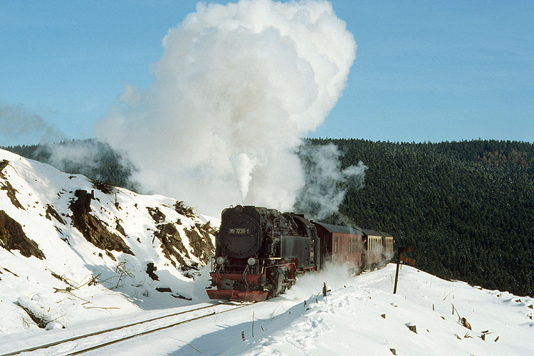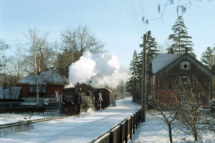 Am ehemaligen Kreuzungsbahnhof Drängetal konnte ich den Zug eine halbe Stunde später nochmals aufnehmen, 07.03.1989. Heute liegt hier wieder ein Ausweichgleis, durch die Wiederinbetriebnahme der Brockenbahn ist der Zugverkehr dichter als zu DDR-Zeiten. |