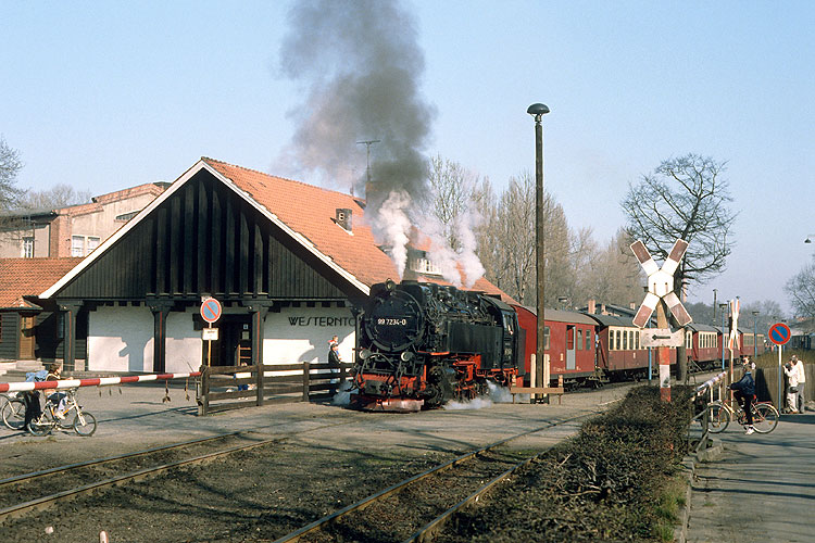 Einen Monat später war ich erneut zu den Harzer Schmalspurbahnen aufgebrochen. Unter anderem fotografierte ich da 99 7234 mit dem P 14405 nach Nordhausen bei der Ausfahrt aus dem Bahnhof Wernigerode-Westerntor, 17.03.1990. |