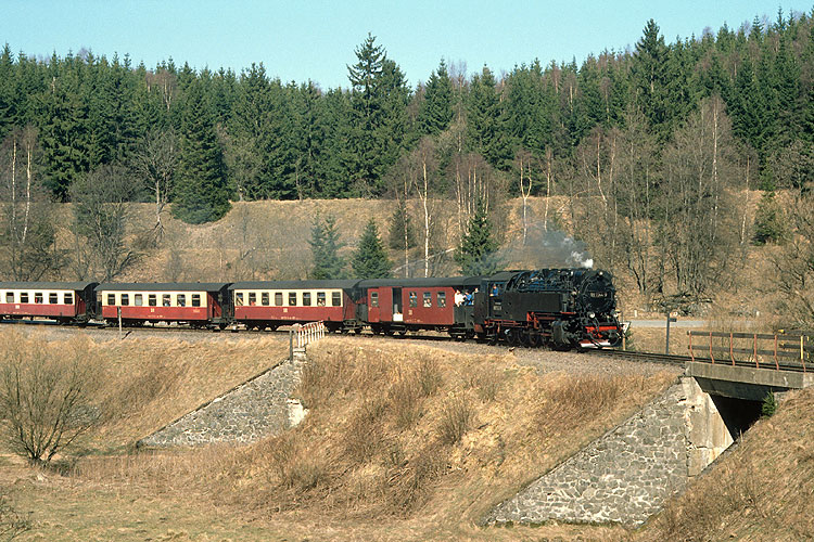 Nun konnte ich auch meine neue Freiheit nutzen und die noch wenige Monate zuvor unerreichbare Stelle bei Sorge aufnehmen, wo die Strecke am dichtesten am Eisernen Vorhang verlief. Der P 14405 mit 99 7234 wird gleich die Reste der Überführung der Südharzeisenbahn nach Braunlage / Walkenried passieren, über diese Brücke war 1947 der letzte Zug gefahren. |