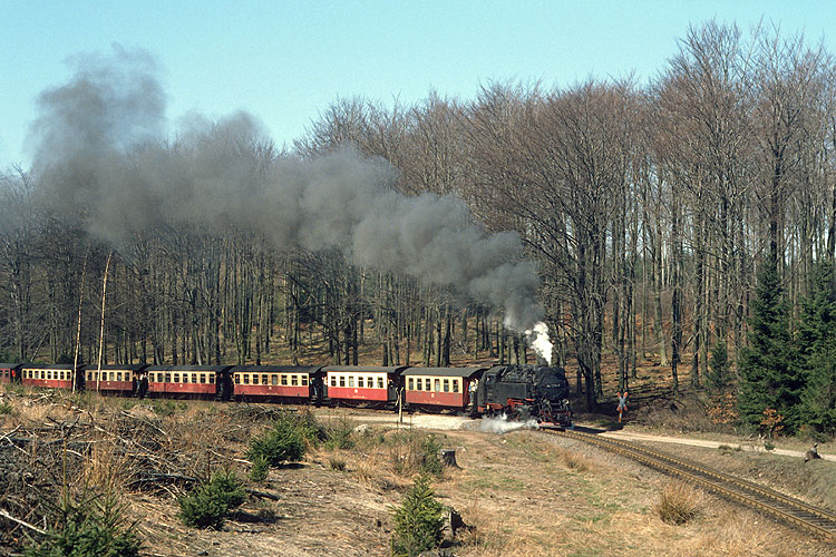 Im Wald bei Sorge ist hingegen 99 7239 mit dem Mittagszug P 14405 nach Nordhausen unterwegs, 11.04.1992. Vor der Wiederinbetriebnahme der Brockenbahn waren die durchgehenden Züge Wernigerode - Nordhausen und zurück Hauptbestandteil des Fahrplanes, vier Zugpaare verkehrten täglich. |