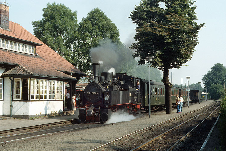 Einsätze des Traditionszuges von Wernigerode nach Benneckenstein und zurück finden in den Sommermonaten regelmäßig statt. Auch sonst ist der Zug zu allerlei Anlässen im Einsatz, gezogen meist von einer der Mallet-Lokomotiven. Am 28.07.1990 war 99 5902 im Rahmen der planmäßigen Einsätze Zuglok, aufgenommen bei der Ausfahrt aus Wernigerode-Westerntor. |