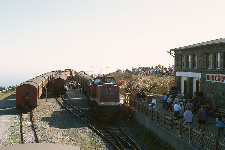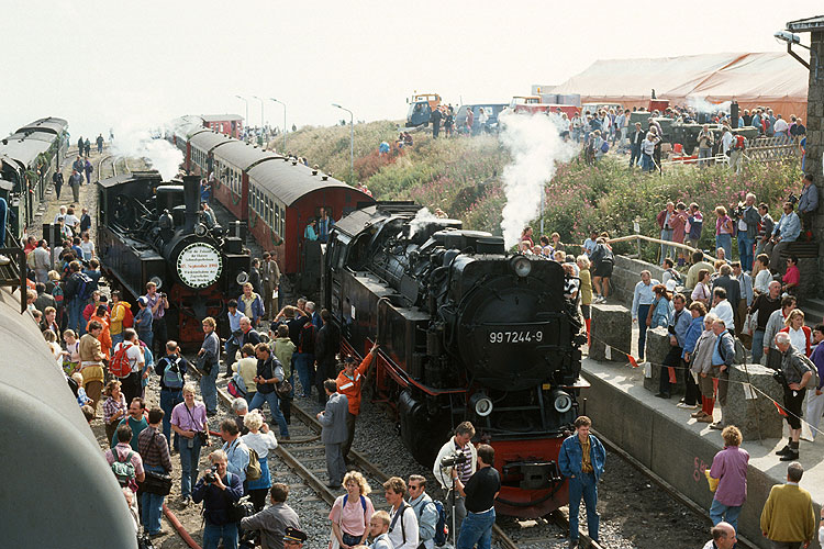 Am 15.09.1991 war es endlich soweit, die Brockenbahn wurde wieder für den öffentlichen Personenverkehr in Betrieb genommen. Menschenmassen bevölkerten das Brockenplateau und feierten ausgiebig dieses denkwürdige Ereignis. Zwei Sonderzüge fuhren als erstes auf den Brocken, hier Zug 2 mit 99 7244 und links Vorspannlok 99 5902. |