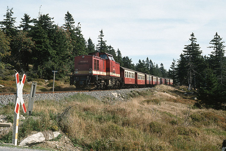Eine Woche später war ich nochmals auf dem Brocken, 199 870 passiert mit einem bergwärts fahrenden Zug die Stelle, wo einst die Strecke mittels Tor die Brockenmauer durchquerte, 27.09.1992. |