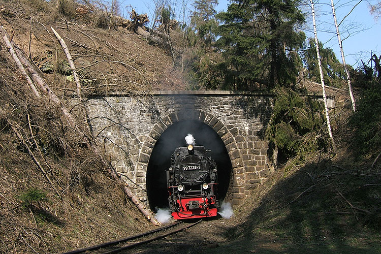Mit einem Brockenzug durchfuhr am 02.04.2007 99 7238 den Tunnel durch den Thumkuhlenkopf. Heute wird der Brockenverkehr wieder ausschließlich mit Dampf abgewickelt, weil es die oft von weither angereisten Fahrgäste so erwarten. Durch die hohe Zugdichte kann man hier auch heute noch Dampfatmosphäre vom Feinsten mit allen Sinnen erleben. Wohl nirgendwo sonst in Deutschland kommt man dem "echten" Dampflokeinsatz so nahe wie hier, wenn mich mal wieder die Sehnsucht nach der Dampflokzeit packt, weiß ich wo ich hinfahren kann. |