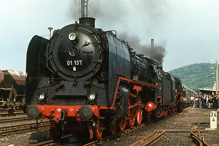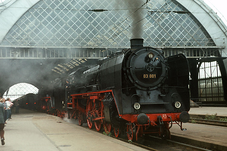 Kurz darauf rollten die Zugloks unseres Sonderzuges an - 03 001 + 01 137. Diese beiden brachten unseren Zug erst einmal bis Bischofswerda. |