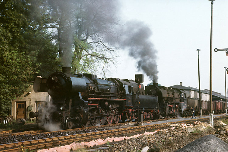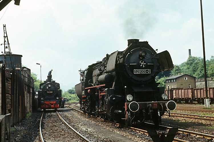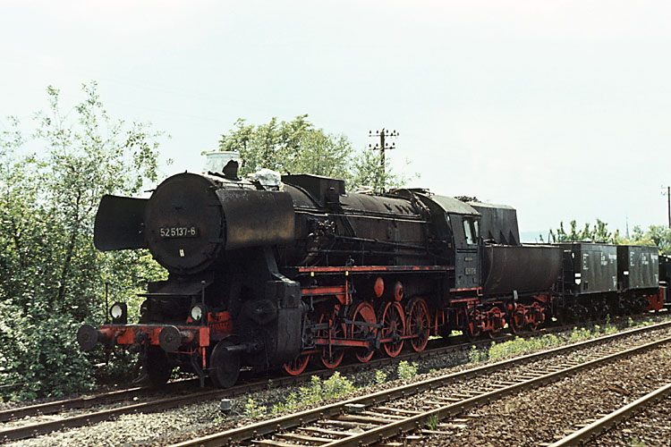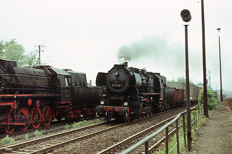 52 8195 Bw Zittau passierte mit einem Güterzug die abgestellte Altbau 52 5137. |