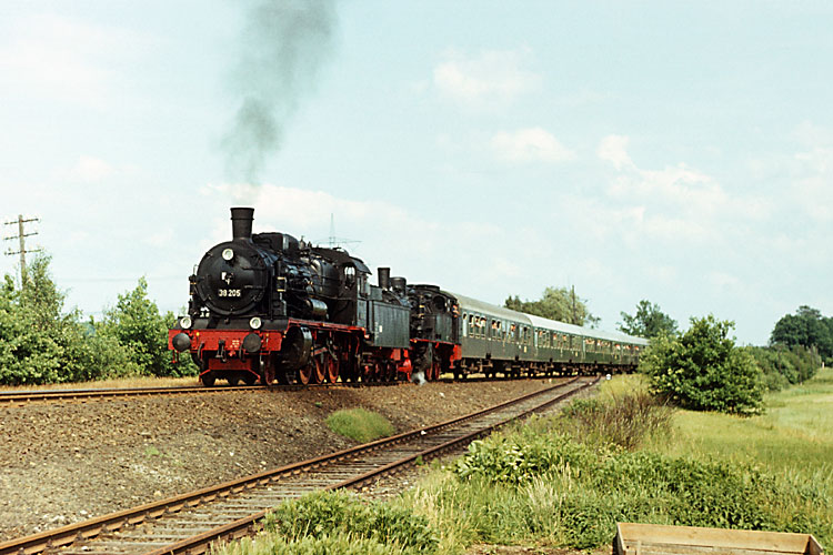 Auf der Rückfahrt nach Dresden gab es wieder Fotohalte mit Scheinanfahrt. Dieses Mal lief ich soweit wie möglich entgegen der Fahrtrichtung des Zuges - in der Hoffnung, das dieser dann auch soweit zurückdrückt. So wurde ich mit dieser Aufnahme von 38 205 + 74 1230 in Obercunnersdorf ohne störende Fans im Bild belohnt. |