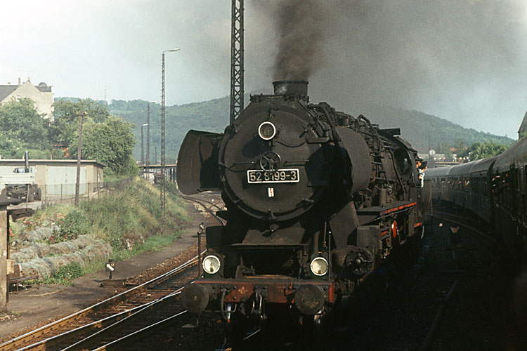 Bei der Ausfahrt aus dem Bahnhof Löbau fuhren wir noch an der wartenden Zittauer 52 8199 vorbei. Das war meine erste und letzte DMV - Sonderfahrt des BV Dresden gewesen, nochmal wollte ich mir so eine Massenveranstaltung nicht antun. |