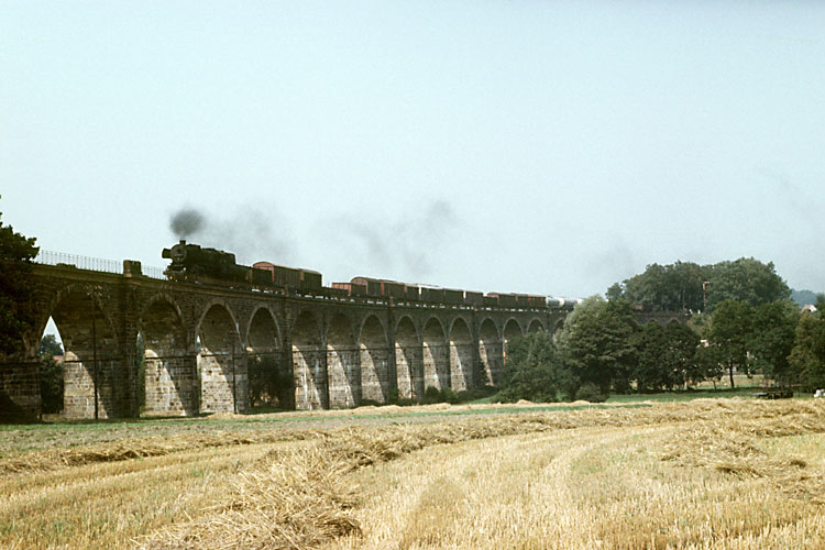 Wir hatten in Kamenz auch erfahren, das die Reisegruppe als nächstes den N 65277 Bischofswerda - Zittau machen wollte. In der Hoffnung auf eine weitere Altbau-52 fuhren wir ebenfalls dorthin und konnten so die Zittauer 52 5137 mit dem Nahgüterzug auf dem Viadukt in Putzkau aufnehmen. |
