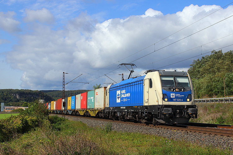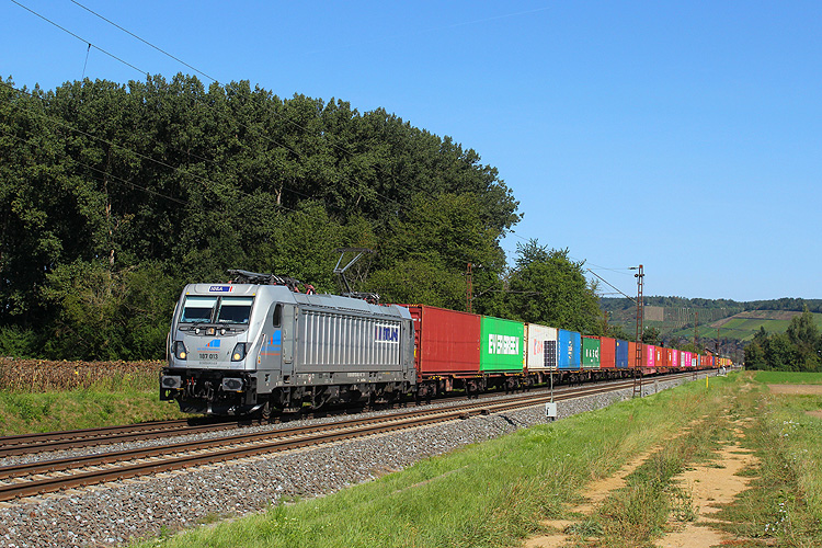 WLC 187 326 fuhr mit einem Containerzug in Richtung Würzburg. |