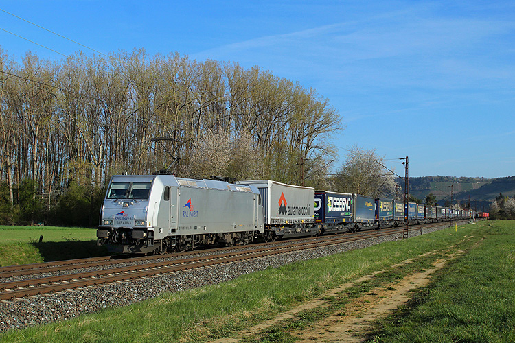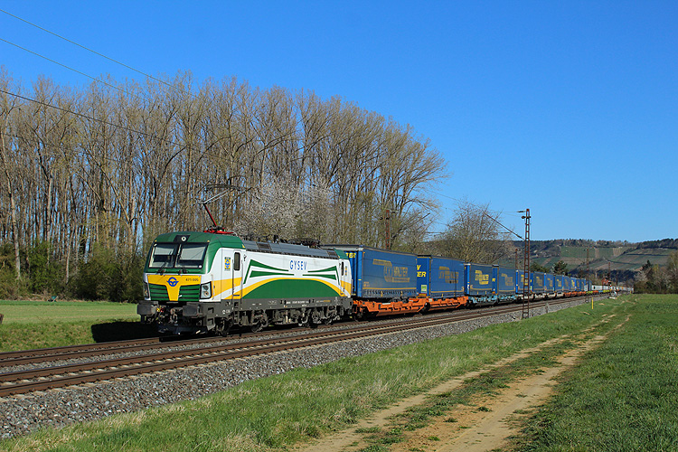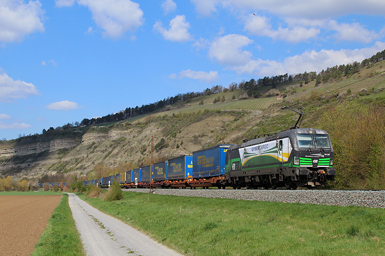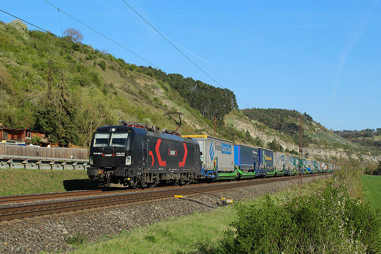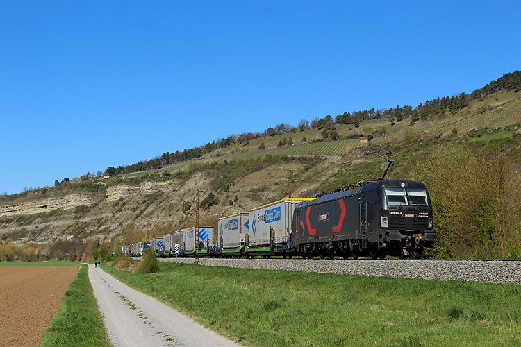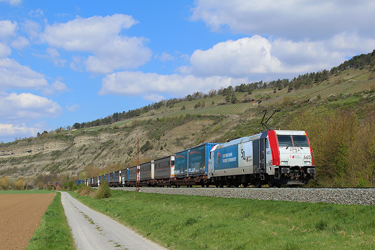 Anfang April 2025 machte ich auf der Anreise nach Basel einen zweitägigen Fotostop im Maintal. Am Samstag 05.04.2025 ging es dabei zunächst nach Thüngersheim. Lokomotion 185 665 kam mit dem Paneuropa/ Terratrans-KLV Bremen - Verona. |