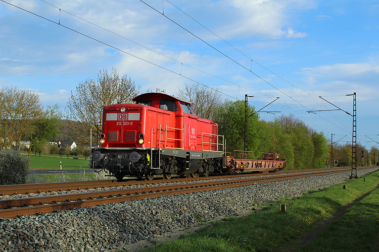 212 323 zog einen leeren Flachwagen in Richtung Gemünden. |