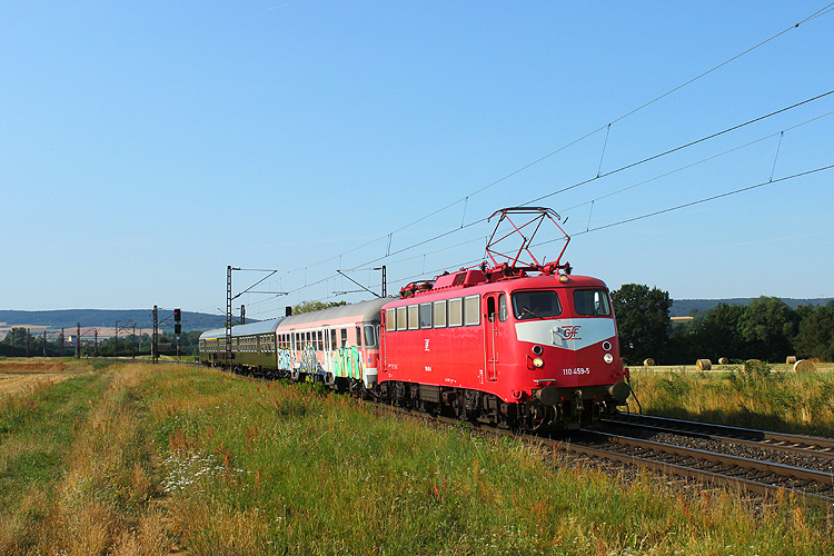 Am Morgen des 09.07.2023 erwischte ich bei Retzbach GfE 110 459 mit einer Wagenüberführung in Richtung Gemünden. |
