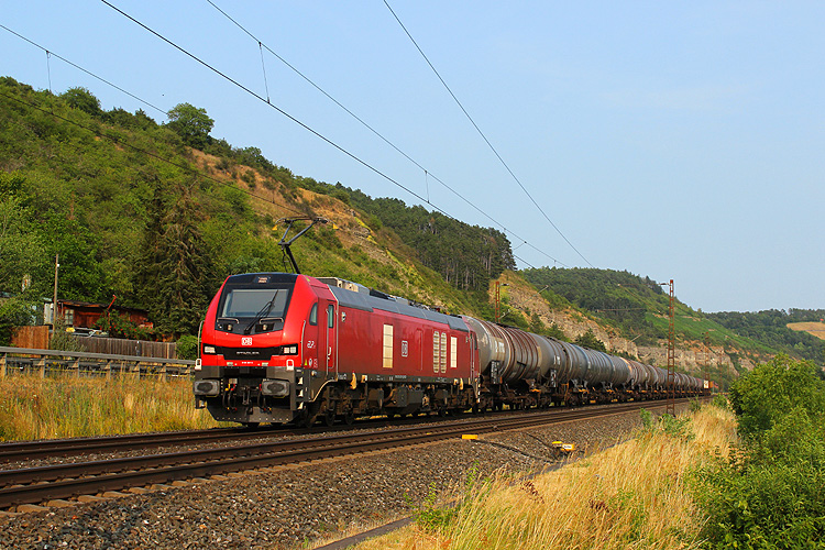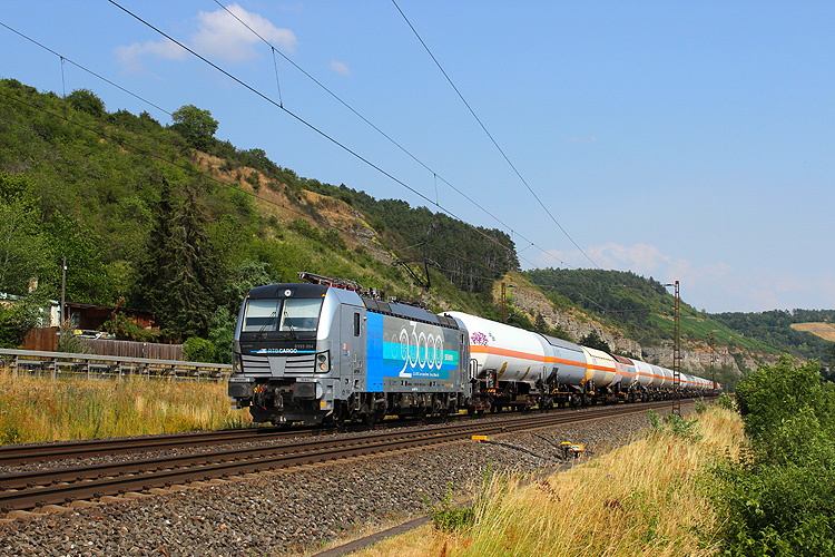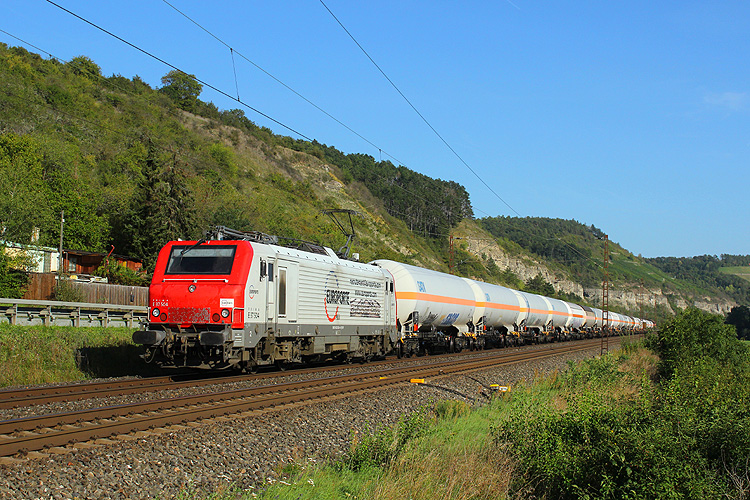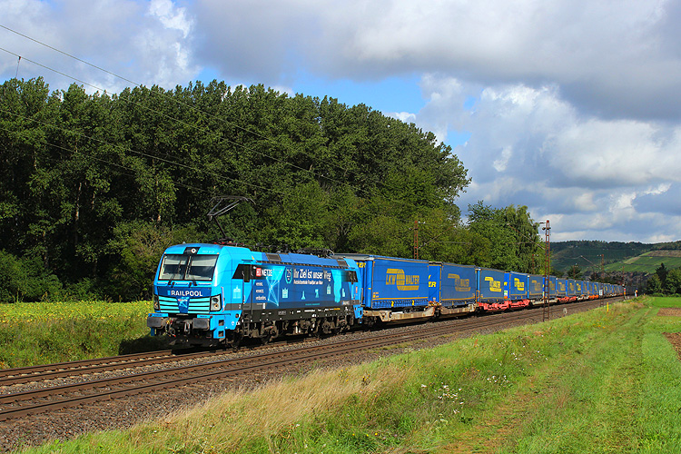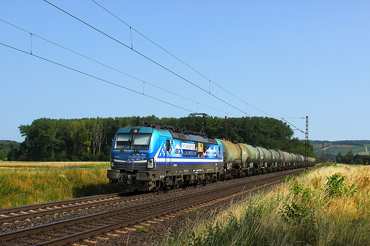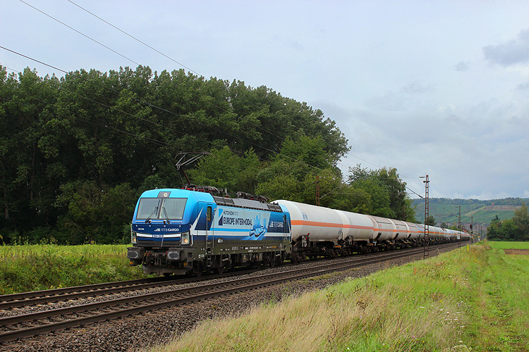 Am 29.08.2023 fuhr mir bei Retzbach die frisch beklebte RTB 193 945 mit einem Gaskesselzug in Richtung Würzburg vor die Linse. |