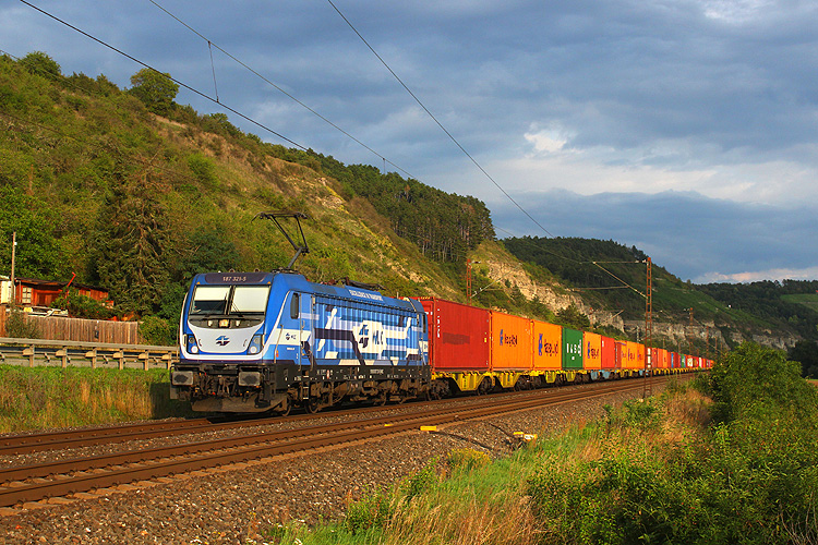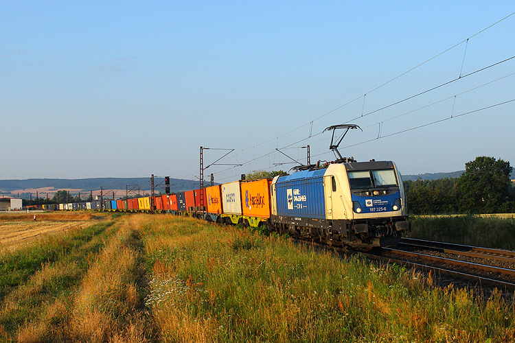Am Morgen des 11.07.2023 bei Retzbach - WLC 187 325 mit Containerzug in Richtung Gemünden. |